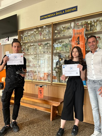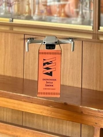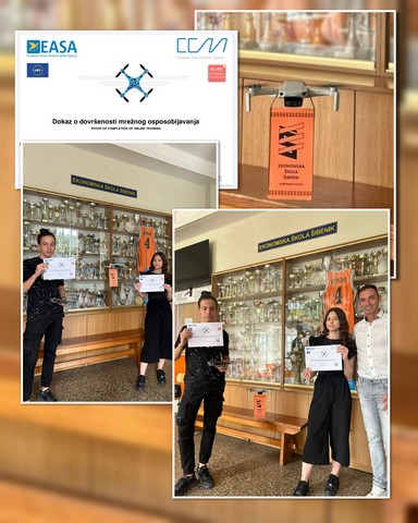 Učenici 2.a razreda Ekonomske škole Šibenik, Mia Maglić i Mate Mihaljević uz nastavnika Ivana Krnčevića sudjeluju u Dron ligi, edukativnom projektu koji je financiran od strane Ministarstva znanosti i obrazovanja Republike Hrvatske u suradnji s Hrvatskim interdisciplinarnim društvom.