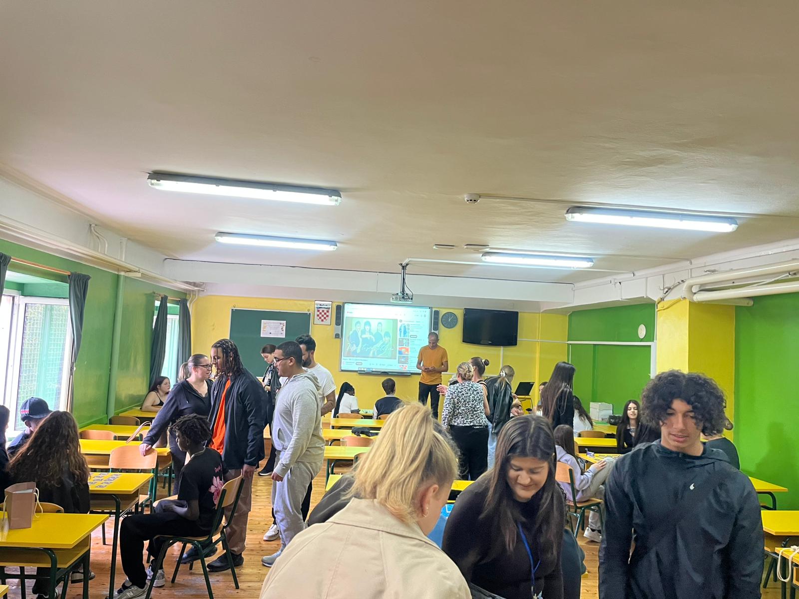 Junior ambasadori i mladi iz Francuske, senior ambasador i nastavnik informatike Ivan Krnčević te koordinatorica projekta Giovanna La Galla iz Udruge mladih u EU, započeli su dan u Ekonomskoj školi Šibenik sudjelovanjem u Eurodesk game partyju. Kroz interaktivne igre i izazove učenici su jačali timski duh, kreativno razmišljanje i međusobno upoznavanje, istovremeno njegovanjem suradnje i zajedništva.